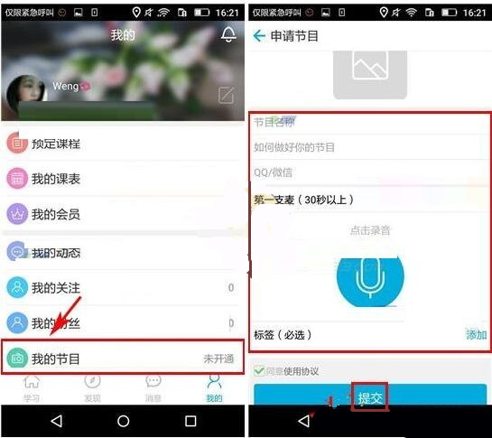2)点击【我的节目】,然后点击下方的编辑框输入节目名称以及节目信息,接着上麦等等,完成这些后点击【提交】即可。(如下图)
