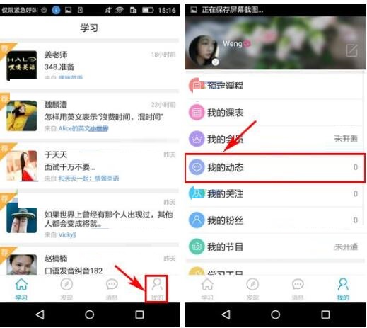 1)打开掌中英语,点击右下角的【我的】,然后点击【我的动态】;(如下图)