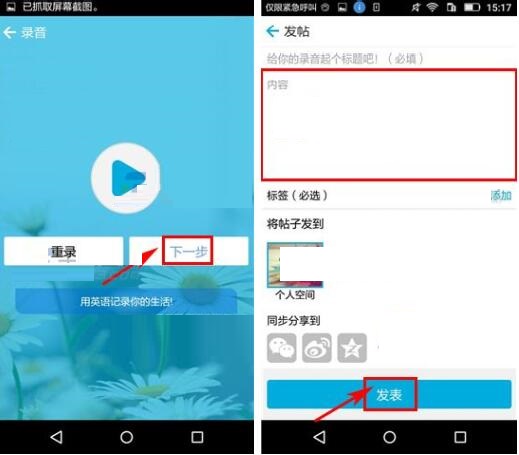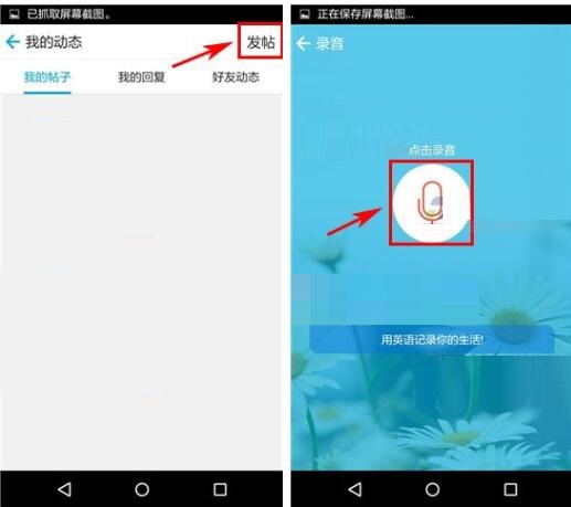 2)点击右上角的【发帖】,然后点击下方的【按钮】开始录制录音;(如下图)