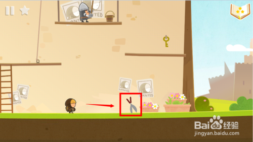 先去拿剪刀,再爬上去把绳子剪断,那个士兵站着的架子掉下来,就可以跑过去得到钥匙。拿到钥匙后点击上方的松鼠,这样就完成一个。