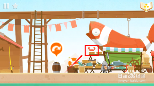 我们先点击藏身处上方的螃蟹,他掉下来后把他拿走,不要让门卫看到喔!