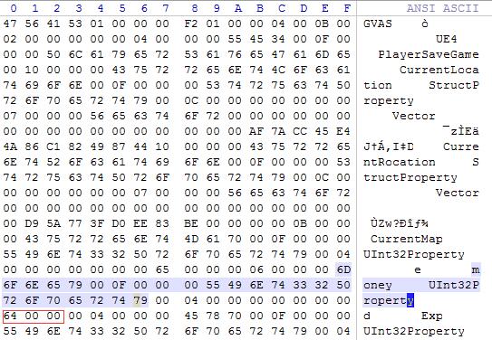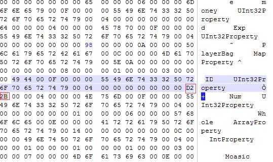 3.金钱修改,找到money Uint32Property并往后数至第十组,就是金钱值的位置,如下图红色区域,