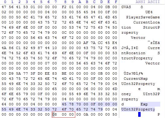 5.经验值修改,找到Exp Uint32Property并往后数至第十组,同样将08 00 00值改为7F 96 98,如下图红色区域,修改完成后,保存,进入游戏获得经验生效