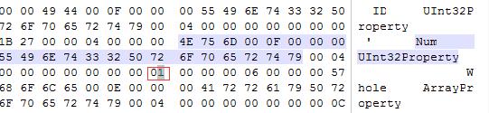 7.物品数量修改,找到Num Uint32Property 并往后数至第十组,如下图红色区域,01就是该物品数量,将01 更改为 64,然后保存。