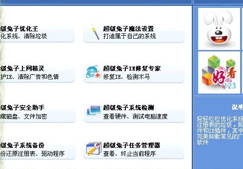 超级兔子是一个完整的系统维护工具,可能清理你大多数的文件、注册表里面的垃圾,同时还有强力的软件卸载功能,专业的卸载可以清理一个软件在电脑内的所有记录。 超级兔子共有8大组件,可以优化、设置系统大多数的选项,打造一个属于自己的Windows。超级兔子上网精灵具有IE修复、IE保护、恶意程序检测及清除工能,还能防止其它人浏览网站,阻挡色情网站,以及端口的过滤。