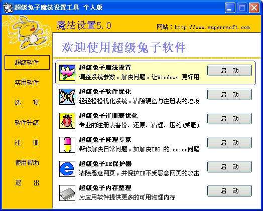 超级兔子魔法设置是一款拥有超过10年历史的老牌计算机功能辅助软件,超级兔子魔法设置可助用户轻松辨别硬件的运作状态、安装硬件的驱动程序、维护系统安全、安装系统补丁及软件升级、优化系 统功能、清除系统的多余文件、提升电脑速度、保护IE安全、监测危险程序、屏蔽广告弹窗、清理流氓软件,真正为用户打造属于自己的贴身安全系统。