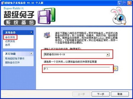 2、打开“超级兔子系统备份”窗口,在左窗格中单击“系统备份”栏目中的“系统备份”选项。然后在右窗格中输入备份文件名称,并指定备份文件的保存位置。完成设置后单击“下一步”按钮