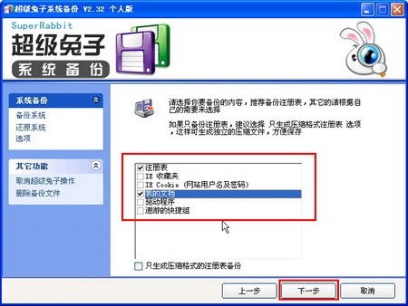 3、在打开的选择备份内容窗口中,用户可以根据需要选择要备份的内容。本例选中“注册表”和“我的文档”复选框,并单击“下一步”按钮