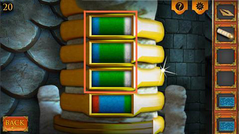用钥匙打开铁柜出现机关,用对应刚刚在墙上看到的圆盘来调整,打开后拿到梯子。
