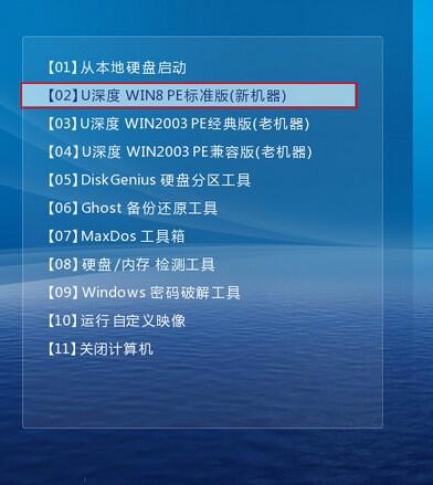 1、将u深度u盘启动盘连接至电脑,重启等待出现开机画面按下启动快捷键进入到启动项选择窗口,选取【02】U深度WIN8PE标准版(新机器),按下回车键执行操作,如图所示:
