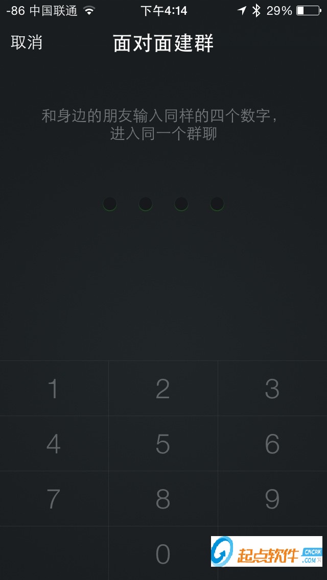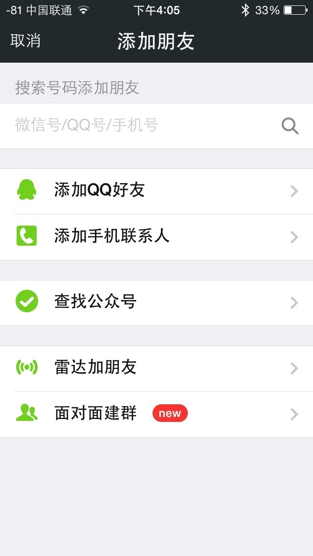 新版中加入了一个面对面建群的功能,免去了在好友列表中查找的麻烦。打开通讯录,点击右上角的添加朋友,选择最下面的面对面建群。只需要和身边的人关于输入同样的四个数字,便可以进入同一个群聊。