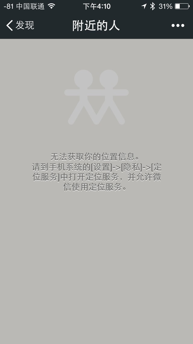 在“发现”页面里,查找附近的人就可以看见自己周围有哪些人正在使用微信。如果点击之后页面变灰,说明没有开启地理位置定位。这是出于对隐私的保护,这种状态下,陌生人是不能向你发送好友申请的。开启地理位置的方法是:在主屏幕选择 设置>隐私>定位服务。在定位服务的下方的诸多程序中找到微信,右边的按钮呈灰色,把按钮上的圆形键往右移,按键成蓝色后就打开了。(以后如果要关闭,也是在这里弄!)回到主菜单再次进入微信以后,周围的人就会以距离由远及近的顺序出现了。点入感兴趣的人,可以跟他们打招呼了。