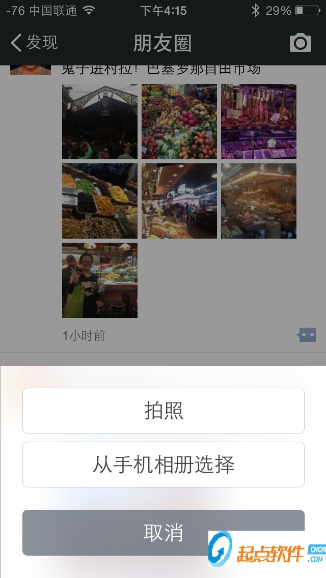 当然,自己也可以发送图片,只需点击右上角的照相机按钮(长按可发纯文字内容),就可以照相或选择相册里的照片上传。用户可以自己添加备注,加入当前位置,设置可见范围,或者提醒某个好友观看这条消息。