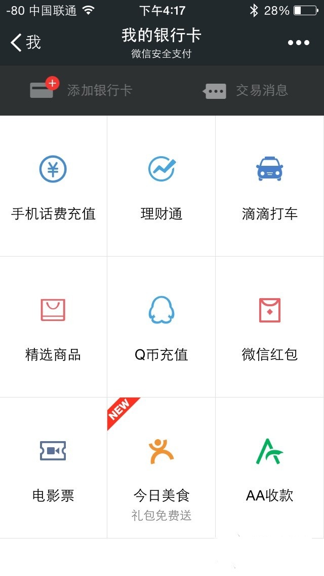 在新版中,微信把很多功能设置都集成到了“我”界面中。首先讲一讲微信的支付功能。打开“我的银行卡”,在这里用户可以充值话费,个人理财,嘀嘀打车,网上购物,Q币充值,微信红包,电影票在线购,美食点评以及AA 收款。在使用支付功能前,用户需先添加一张银行卡,添加后使用支付功能,只需要支付密码和短信验证码便可快速进行支付了。可以说支付功能遍及生活各个方面,还是比较全的。