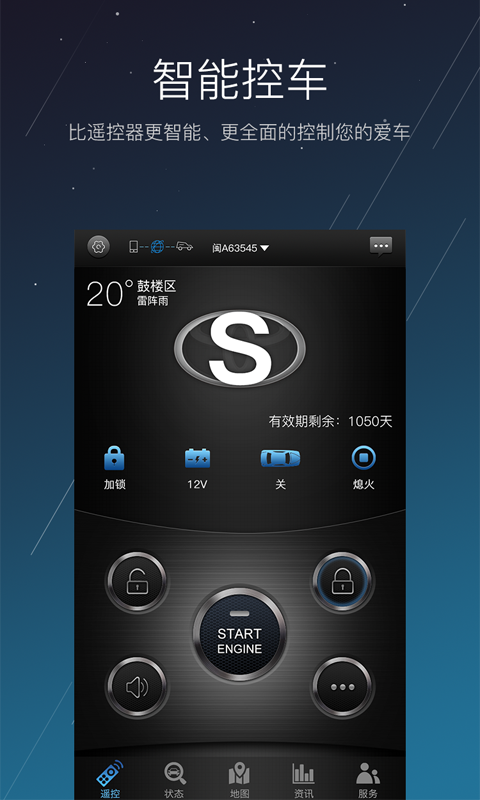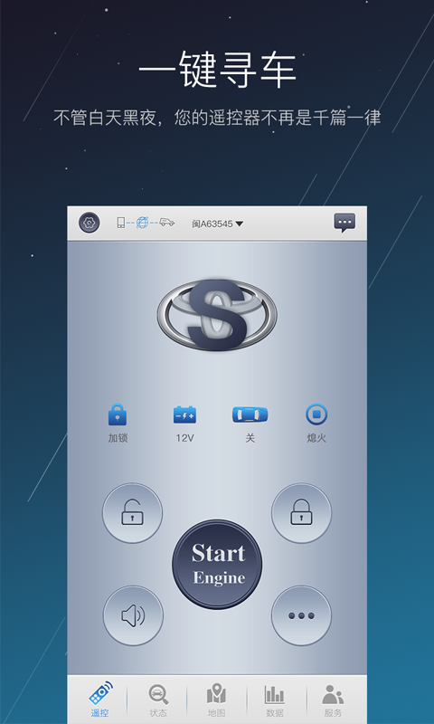 云控:开锁、关锁、启动、熄火、寻车、开启后备箱(不限距离);掌控:各种状态(电瓶电量、防盗状态、车门状态、启动熄火等);