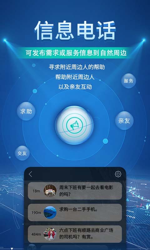 【信息电话】可发布需求或服务信息到自然周边,寻求帮助或帮助他人,以及亲友互动,交友互动。