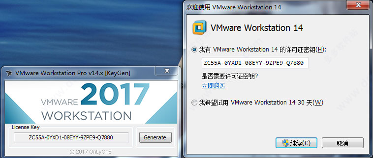 7、打开VMware 14注册机,点击“Generate”,然后将生成的VMware 14注册码复制负内即可完成破解。