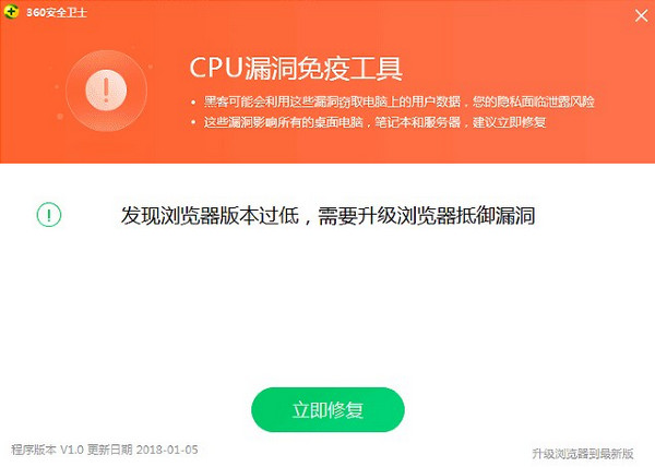 由于CPU漏洞的最大威胁是针对浏览器的恶意网页攻击,免疫工具会对浏览器进行检测,提示用户升级到已有补丁的最新版本,从而阻断恶意网页攻击CPU漏洞的入侵通道,为此漏洞唯一的远程攻击入口建立牢固的安全防线。