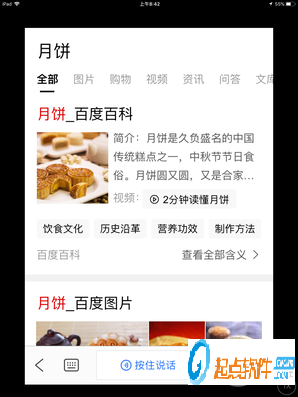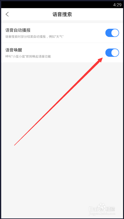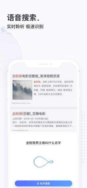 简单搜索默认为语音输入搜索方式,大家可以用按住说话形式进行搜索,也可以在选项设置中开启语音召唤功能之后就可以用“小度小度”召唤出语音输入。
