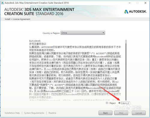 下载Autodesk 3d max 2016安装包,解压后开始安装,安装之前要断网,双击setup.exe安装,打开后选择install 安装,和其它版本的安装方法差不多,来到协议书里面,选择我同意,IAccept ,下一步。