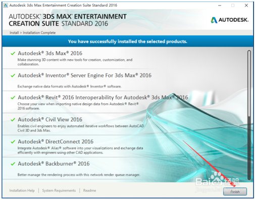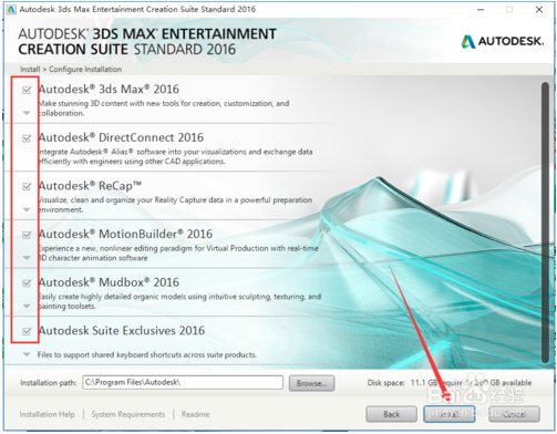 来到这里之后看一下软件自带选项有没有全选择,如果没有可以全选择上,这样安装的Autodesk 3ds max 2016是全总的。位置可以自己选择,这里就不选择了,直接安装在C盘。