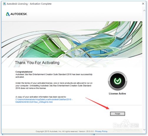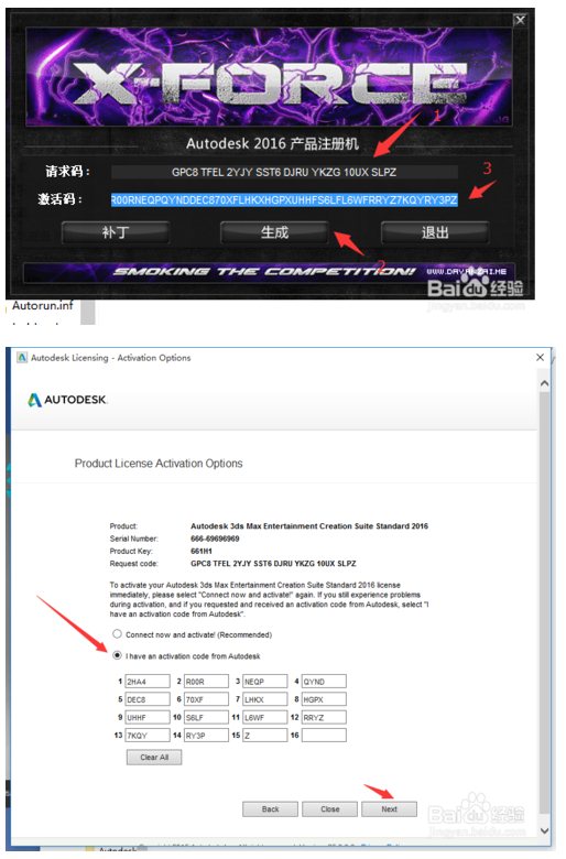 打开下载好的Autodesk 3ds max 2016注册机,把request code粘贴到激活器request,点击generate,再点击Patch,复制activation,粘贴到i have an activation code from autodesk,选择下一步。