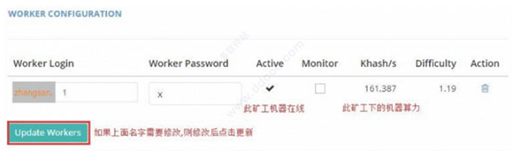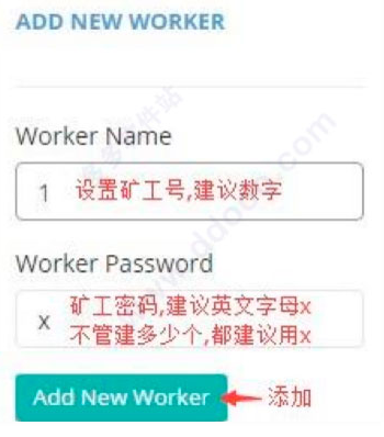 ④你会发现,Worker Login 是账号加矿工号的组合,没错,这个组合就是挖矿要用的了,例如我注册时候的账号为:zhangsan 矿工号为1,那么组合起来就是zhangsan.1。现在我们就可以使用这个账号来挖矿了。