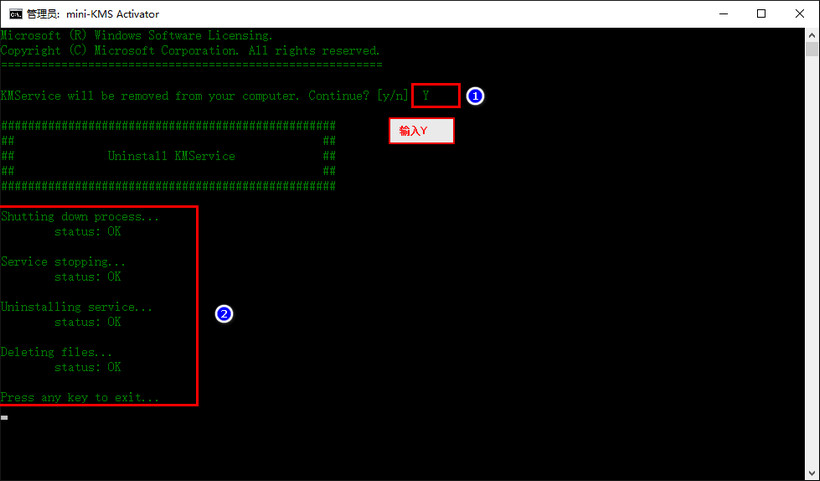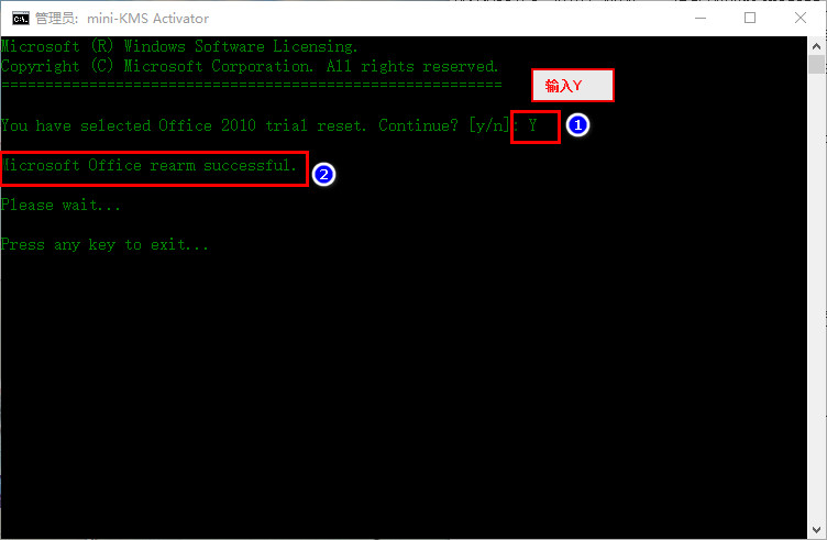 11.继续输入“Y”.然后会提示“Microsoft Office rearm successful”.按任意键退出。如下图