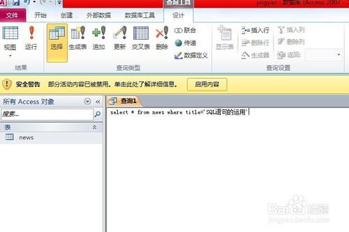 如果我们只想查询news表中的“title”字段为“SQL语句的运用“那又该如何写呢?这时我们就要用到sql语句的条件语句也就是where语句。