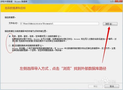 左侧选择你要导入外部数据库的方式,点击浏览,找到外部数据库存放的路径