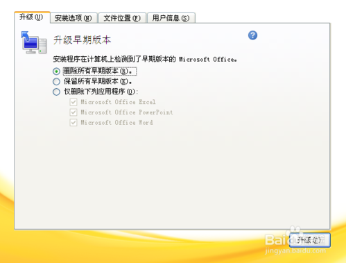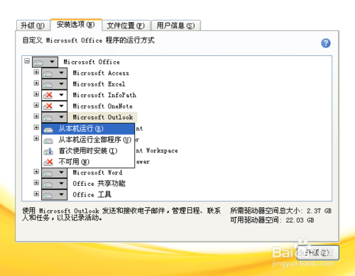 在安装选项里面可以把你不想安装的选为不可用,这样就不会安装到电脑上。例如,我只想安装2010版的access,那就把其它的都选为不可用。(最后一个office工具不要选为不可用)