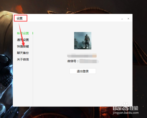 8、设置按钮。我们可以设置你聊天用的快捷键、聊天备份、消息通知、也可以退出登录。