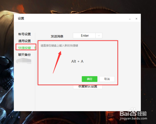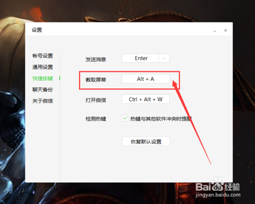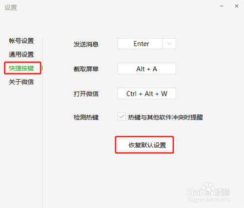 点击左侧快捷按键,可以设置发送消息、屏幕截取、打开微信的快捷键,并且可以恢复默认设置。