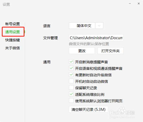 点击左侧通用设置,可以设置微信语言、文件存放位置、消息提示音等一些常用操作。