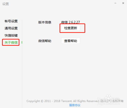 点击关于微信,可以查看当前微信的版本信息,并且可以检查是否有新版本可以更新。