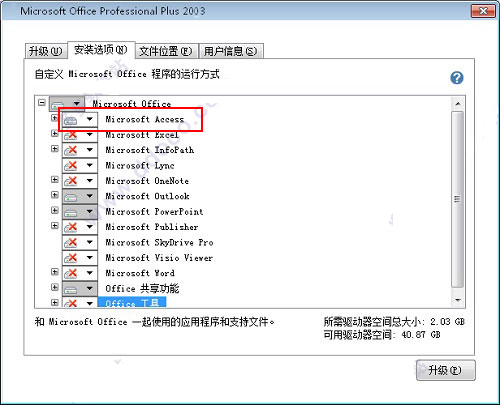 5、选择自定义安装后,在组件设置中将所有其他组件全部关闭,只留下access2003即可。