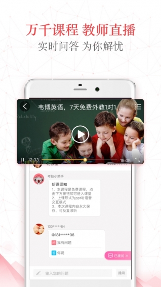考拉微课,专业知识分享平台,让知识获取更容易。覆盖理财、情感、教育、亲子、职场、生活、健康、商业等多个类目,各行各业专家、老师直播课程,实时在线回答问题,知识从未离你从此近。