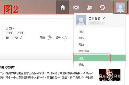2、进入个人邮箱以后,找到页面右上角的小人头,然后点击一下,在下拉菜单中选择“设置”,如图2所示。