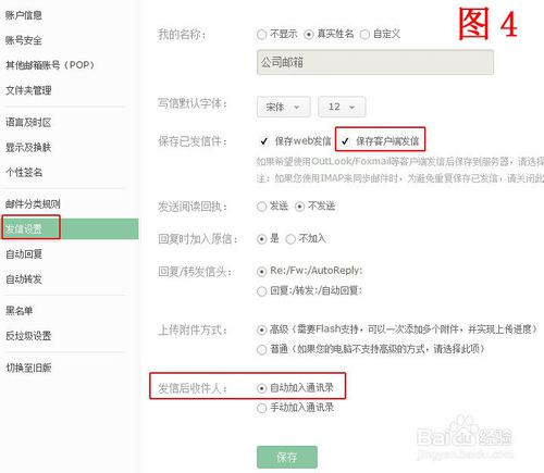 4、接下来点击左侧栏目中“发信设置”,然后看右边,找到“发信后收件人”,把“自动加入通讯录”打上勾,确保联系人让263系统确定为友好。使用客户端的同事,找到“保存已发信件”,在“保存客户端发信”复选框中打钩,目的是用客户端发信后,网页邮箱的“已发送”中也会保存发信内容。其它方面根据个人需要进行设置。