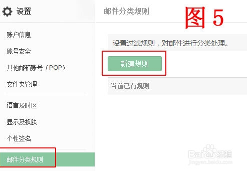 5、仍然是左侧栏目,点击“邮件分类规则”,在右侧出现的界面中选择“新建规则”,如图5所示。