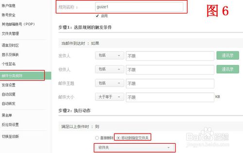 6、在弹出的页面中,规则名称随便起一个好了,如“guize1”,在步骤1:选择规则的触发条件中,不做修改,在步骤2:执行动作,中则….选择“移动到指定文件夹”,然后在下拉列表中选择“收件夹”,然后点击“保存”,如图6所示。此措施的目的好像是不管发件人是谁,邮件统统移到收件箱(个人理解),不过肯定会产生相当的没用的邮件,如果感觉不合适,此规则将来还可以删除。