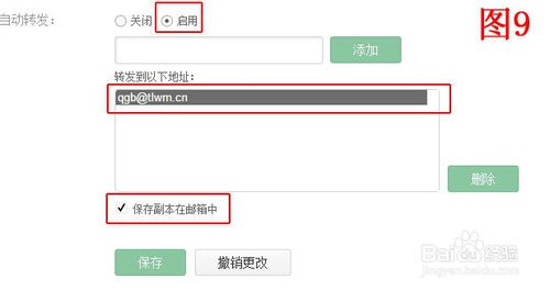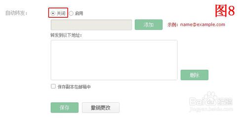 8、这里有必要对左侧栏目“自动转发”功能提一下,点击后看右侧,一般情况下本人选择“关闭”。如图8所示。那么,自动转发是干什么的捏?如图9所示。选择启用后,添加一个个人邮箱如xxxxxx@163.com,当邮件到达邮箱后,它会自动转发到你添加的邮箱中(有人可能一直用个人邮箱,设置了这个功能后,公司邮箱的信会自动发送到个人邮箱中),在这里千万千万注意一点,“保存副本在邮箱中”,一定一定要勾选,不然,公司邮箱的信只转发不留副本,等于是个中转站,什么都没有,之后很可能会造成麻烦,这里介绍“自动转发”功能只是让大家知道该功能怎么使用,怕大家误使用而出错。一般情况下还是选择“关闭”吧,几个邮箱之间邮件倒来倒去总归不好,容易出现问题。此功能尽量别使。