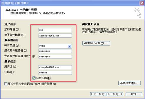 然后填写“接收邮件服务器”及“发送邮件件服务器”信息,登录信息下填写发件人的用户名及密码(注:所有项均为必填项)