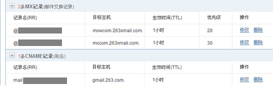 (2)登录后如图,将您域名的mx记录指向到263即可。您可以 点击此处(跳转到“点击此处查看您的服务器地址”) 了解您的mx 服务器及其他服务器地址。注意:MX、CNAME记录请填写主机名。一般情况下请填写主机名的全称,并以“.”结尾