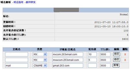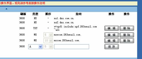 (3)登录后如图,将您域名的mx记录指向到263即可。您可以 点击此处(跳转到“点击此处查看您的服务器地址”) 了解您的mx 服务器及其他服务器地址。注意:MX、CNAME记录请填写主机名。一般情况下请填写主机名的全称,并以“.”结尾