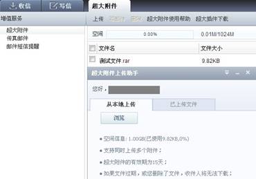 您登录进网页邮箱之后,可以在左侧的“增值服务-超大附件”中下载并安装“超大插件”,这样有较大的附件需要发送时,可以点击“上传”,通过超大附件上传助手将附件上传到超大附件的已上传文件中,已上传文件自上传之日起保留15天,期间您可以选择已经上传的超大附件给对方发送。
