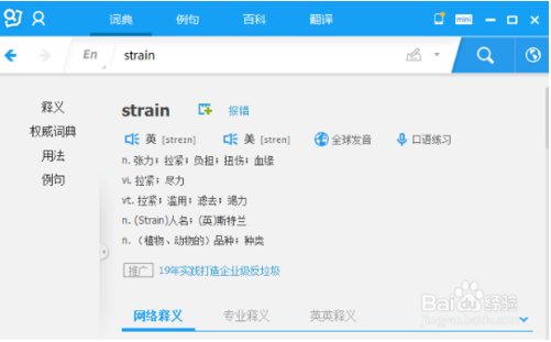 点击翻译助手,我们以单词“strain”为例,如果考过四六级的学生不用查字典也应该知道它的意思。