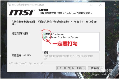 1.双击打开安装界面,默认简体中文,点击ok;2.一直下一步到选择组件界面,一定要在”rivatuner statistics server“前打勾,如果rivatuner statistics server无法安装,检查一下系统版本,在百度下一个安装包安装就可以了;