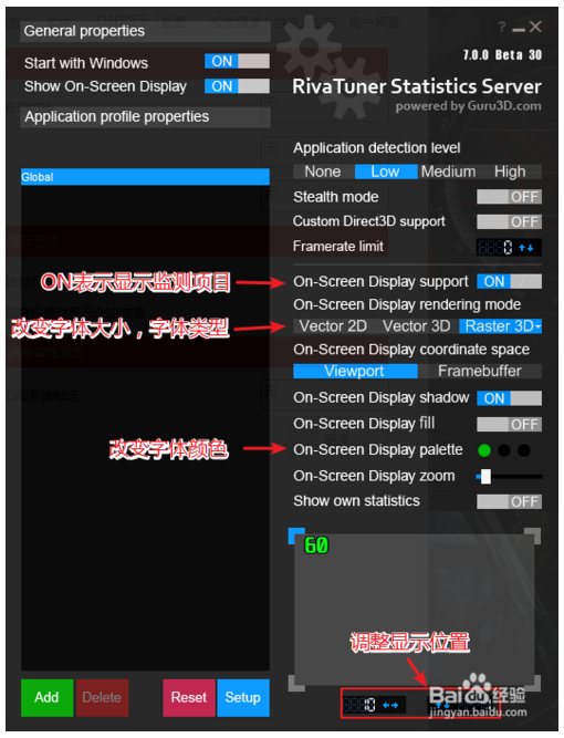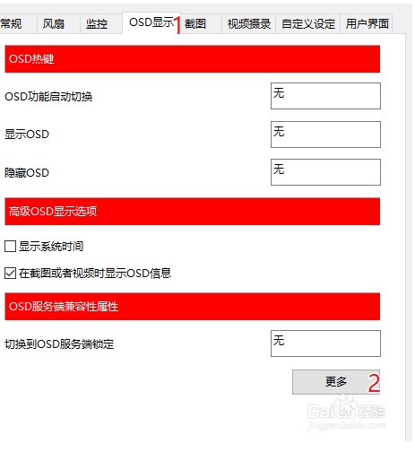 如果要调整显示字体类型、颜色、显示位置等,选择:1.点击”OSD显示“, 2.选择”更多“