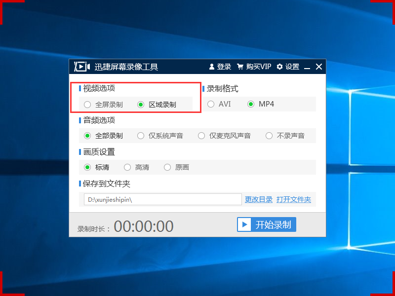 2、用户先在视频选项中选择视频的录制方式,其能够支持全屏录制与区域录制(自定义设置录制范围)两种模式供您选择。用户选择区域录制,可以自定义设置录制的范围,如图,用户调整要录制的范围窗口。
